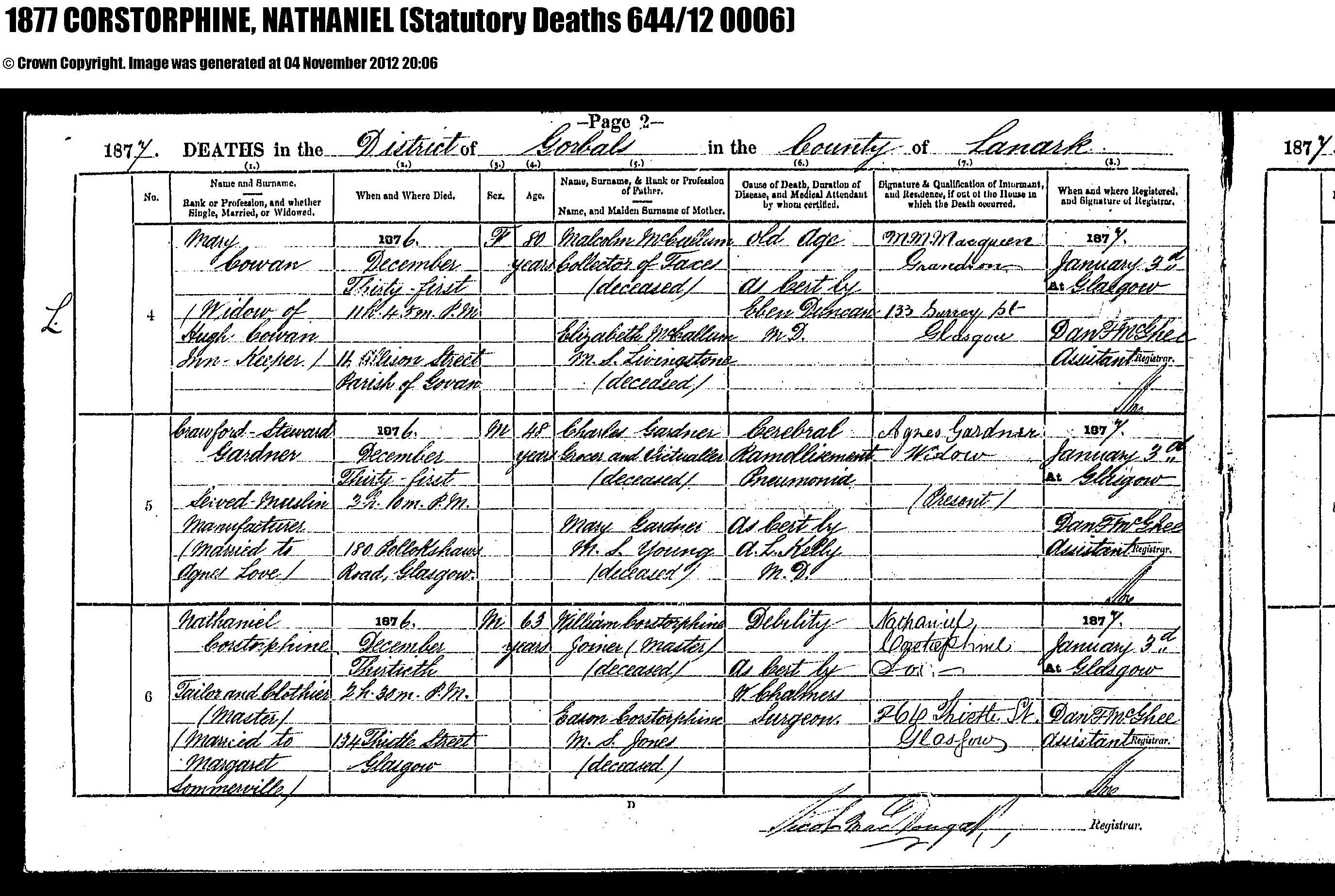 Nathaniel Corstorphine , Tailor and Clothier (Master), Married to Margaret Sommerville Died: 1876 December thirtieth at 134 Thistle St Glasgow, AGE: 63 CAUSE: Debility as certified by surgeon FATHER: William Corstorphine , Joiner (Master), deceased MOTHER: Edson? or Eason Corstorphine MAIDEN: Jones, deceased INFORMANT: Nathaniel Corstorphine 264 Thistle St !!! ???? - QUALIFICATION: ? I think it’s “Son” (should be something like “widow or “grandson” ) (Notice the coincidental death of May Cowan on this sheet too)